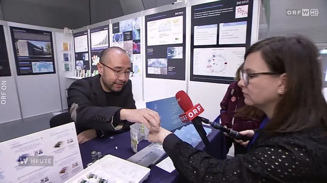 在巡展期间,榕嘉生物作为国家级高新技术企业与上海市专精特新企业,以八大核心技术平台为支撑,重点展示生物资源开发利用平台及其专利转化成果——“天然外泌体”系列产品。在现场奥地利广播电视台的报道与采访中,榕嘉生物向欧洲市场展现榕嘉在精准医学与外泌体技术领域的研发实力。