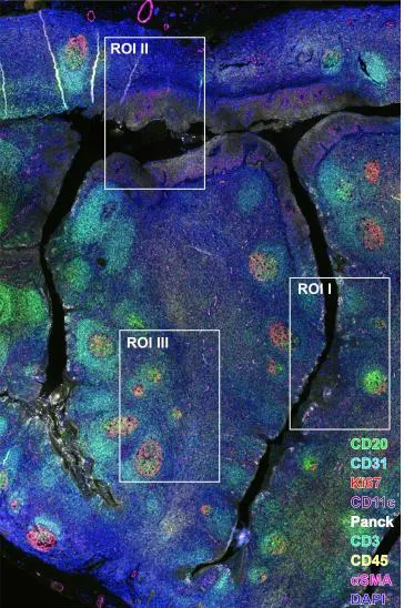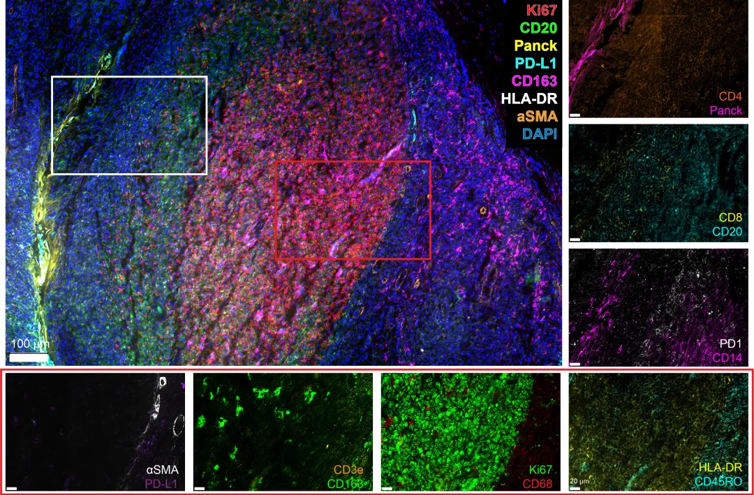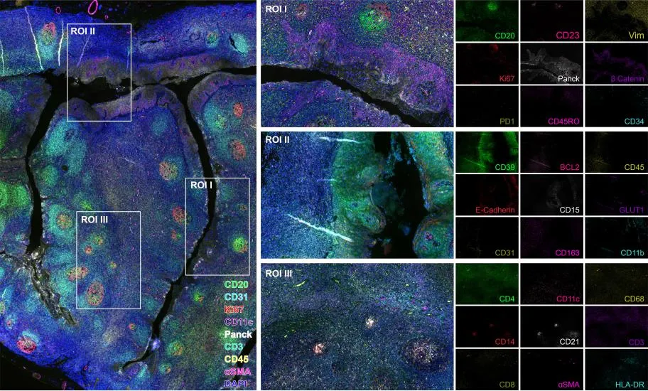 在肿瘤微环境解析中,可在单张切片上实现数十种蛋白的空间定位与共定位关系的同步获取;同时,不用依赖昂贵的质谱等设备,降低总体实验成本的同时可以有效提高效率,并显著减少因靶标拆分带来的重复实验与批间差异。