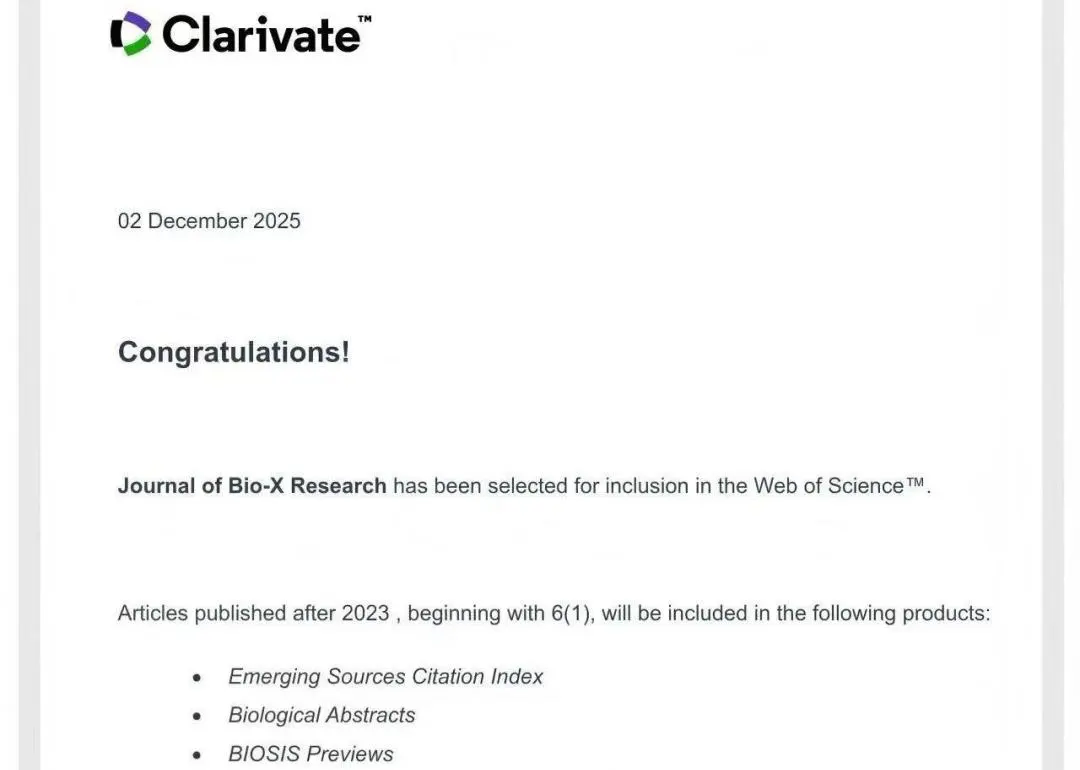 《Journal of Bio-X Research》被ESCI等三大数据库收录。